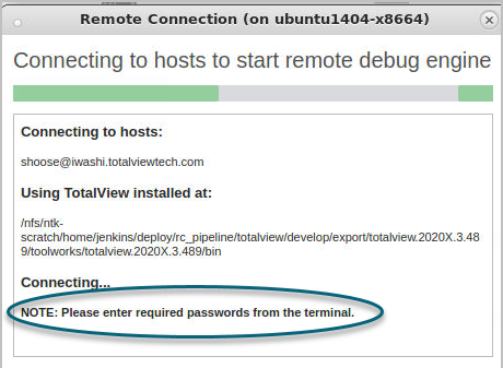 If the remote host requires a password, the dialog prompts you to enter it in the shell from which you launched TotalView.