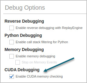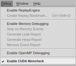 From the Debug menu, choose “Enable CUDA memcheck”: