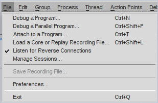 Figure 3. Choosing a Specific Debug Session from the File Menu