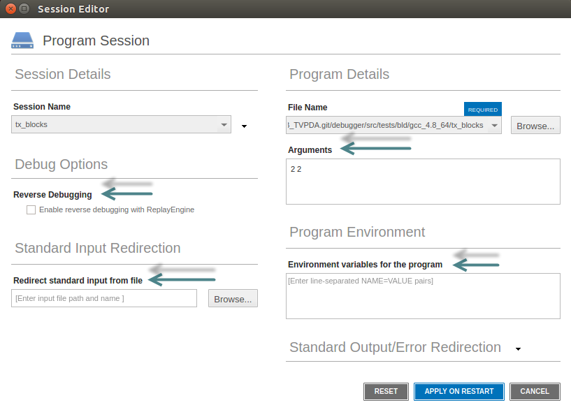 1. From within a debugging session, choose the Process menu, and then Modify Arguments. Alternatively, click the Modify Arguments (