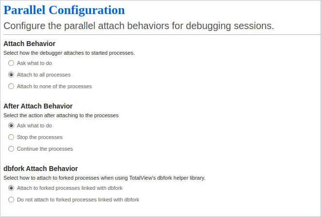 On the Parallel tab of the Preferences dialog, you can configure the following parallel attach behaviors for debugging sessions: