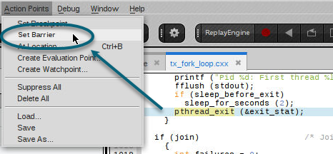Set a barrier breakpoint in the same way as a regular breakpoint: by either selecting the line in the Source pane and selecting Action Points > Set Barrier, or by right-clicking on the line and choosing Set Barrier from the context menu.