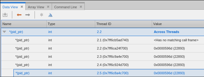 To view a variable value across all processes or threads, add the variable to the Data View, right-click the expression, point to Show Across, and then select Processes or Threads.