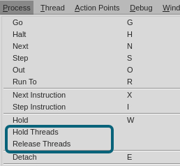 To place a hold on all threads in a process, select the process or a thread in the process, and then click Process > Hold Threads. To release all held threads in a process, select the process or a thread in the process, and then click Process > Release Threads. Whether you have selected the process or a thread in the process, these commands will affect all threads in the process.