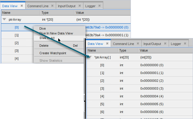 If you have an array of pointers that you first want to dereference to see the values, use Dive In All on a pointer to create a new array of the dereferenced value. In Figure 55, ptrArray is an array of pointers of integers. Using Dive In All on a single pointer creates a new array of just integers in which each element of the original array is dereferenced.