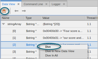 You may wish to retain the parent variable in the Data View rather than replacing it in the view. Choosing Dive in New Data View from the context menu instead of Dive creates a new Data View containing the selected element. The new window is numbered, starting with “<1>.” If you undock or redock one of the Data View windows, you can view both the parent element and the subelement on which you dived side-by-side.
