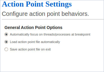 When selected, TotalView automatically loads action points when it loads a file. When this option is not enabled, you can still save the action point file using the Action Points > Load menu option or the dactions -load command. You can also enable this preference by using the TV::auto_load_breakpoints variable.