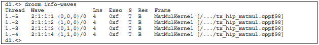 Figure 156 shows four wave threads for a 2x2 grid of 2x2 workgroups. The first column is the debugger thread identifiers for the waves. The second column is the colon-separated agent, queue, dispatch, and wave identifiers for the waves. The third column is the workgroup coordinates and flattened work-item offset of the waves.