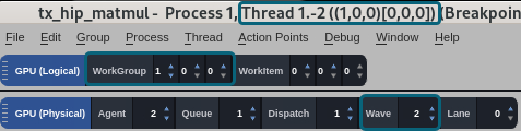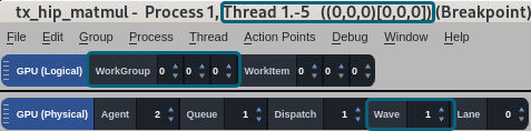 GPU (Logical): This toolbar represents the logical coordinate space that, in AMD GPU terms, incorporates work-groups and work-items. For example, (Bx,By,Bz)[Tx,Ty,Tz], where (Bx,By,Bz) represents the block indices and [Tx,Ty,Tz] represents the thread indices.