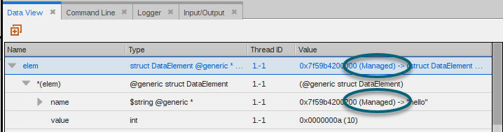 Here, the Data View shows that the variable elem points into managed memory. That is, elem is a pointer and its value points into managed memory; note that the pointer’s value is annotated with "(Managed)".