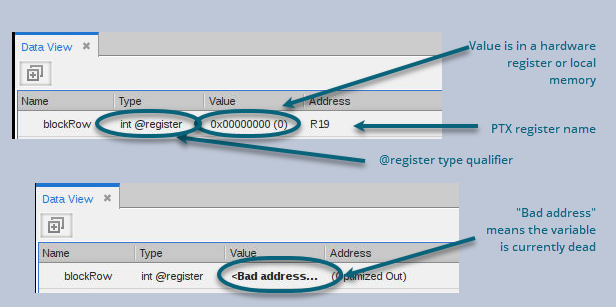 Add an expression from the Call Stack to the Data View to display parameter, register, local, and shared variables, as shown in Figure 134. The variables are contained within the lexical blocks in which they are defined. The type of the variable determines its storage kind (register, or local, shared, constant or global memory). The address is a PTX register name or an offset within the storage kind.