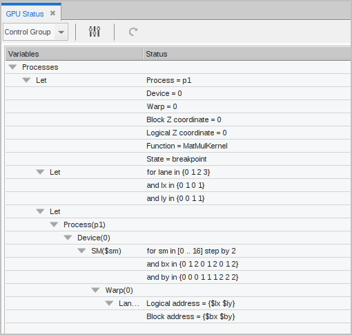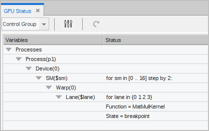 Change the focus width of the view to show the status for either a group (control or share group), a single process (the current process in focus in the UI), or a single TotalView CUDA context thread.