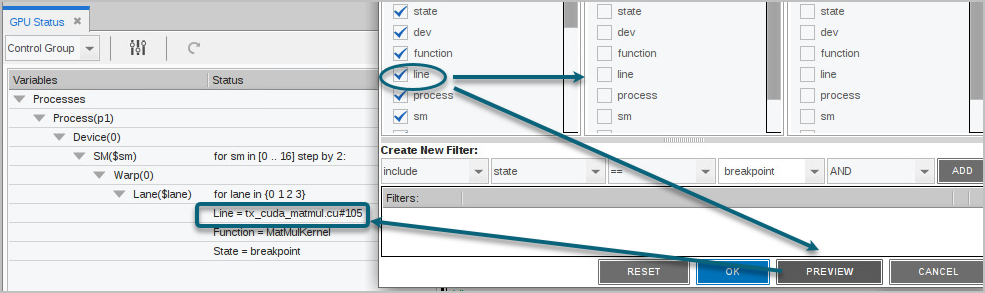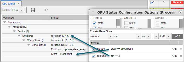 Use “include” and “exclude” together to establish the overall filter behavior, then refine it. Figure 143 first includes all threads at breakpoint, but then excludes those running on SM 2.