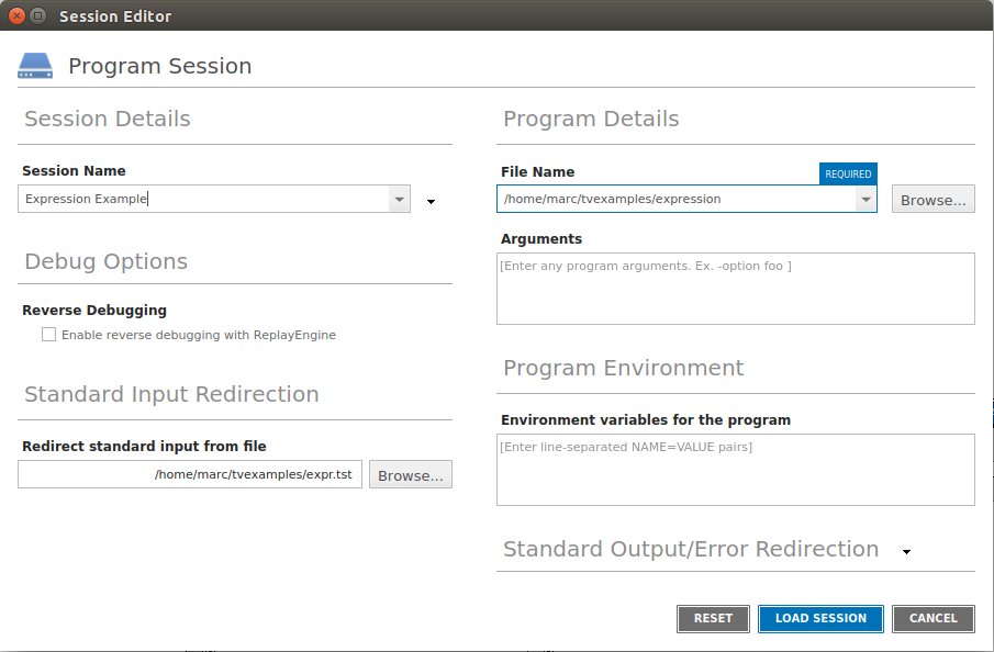 5. In the Standard Input Redirection field, browse to and select the expr.tst file, also located in the examples directory. This provides the input required by the program. Leave all other fields and options as is.