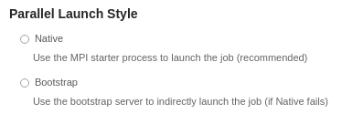 Parallel Launch Style: If the specified MPI supports MPIR debugging interface, TotalView selects Native by default. Otherwise, TotalView selects Bootstrap, which doesn't require MPIR debugging support but may have issues with very high scale jobs. You can also change the default selection from Native to Bootstrap if the former is not working as you expect.