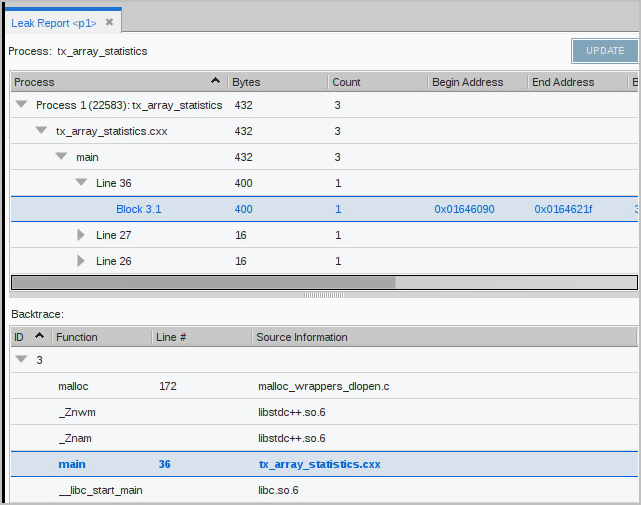TotalView can provide information about these sections and generate a leak detection report, Figure 169.