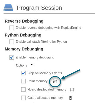 Several memory debugging options are available to refine your debugging session. Set these either in the Session Editor before starting your debugging session or from within a debugging session using the menu item Debug > Memory Options or by selecting the icon “Enable memory debugging” from the memory toolbar.