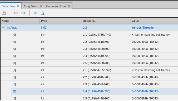 When you show across an array, TotalView displays each element in the array across all processes. You can use a slice to select elements to be displayed in an “across” display. The following image shows the result of applying a Show Across > Threads command to an array of structures.