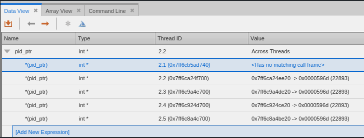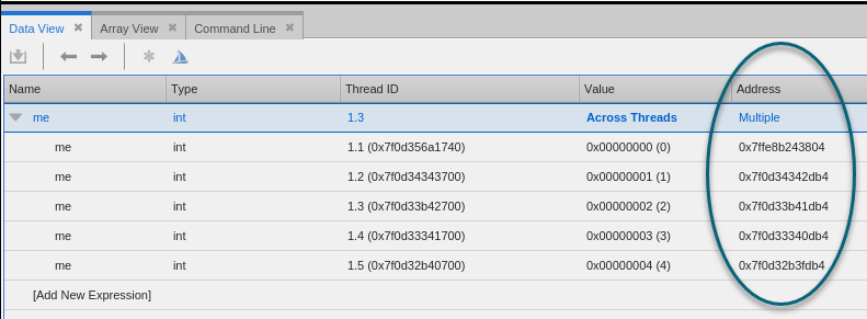 If the variables are at different addresses in the different processes or threads, the expression address is listed as Multiple, and the unique addresses appear with each data item.