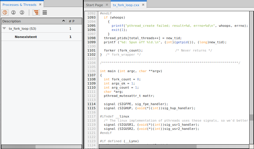 Figure 2 shows the Source view for the program and the Processes & Threads view. These are just two of several available views.