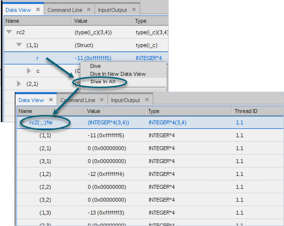 With the array in the Data View, select an r element, right click, then select Dive In All. TotalView displays all of the r elements of the rc2 array as if they were a single array.