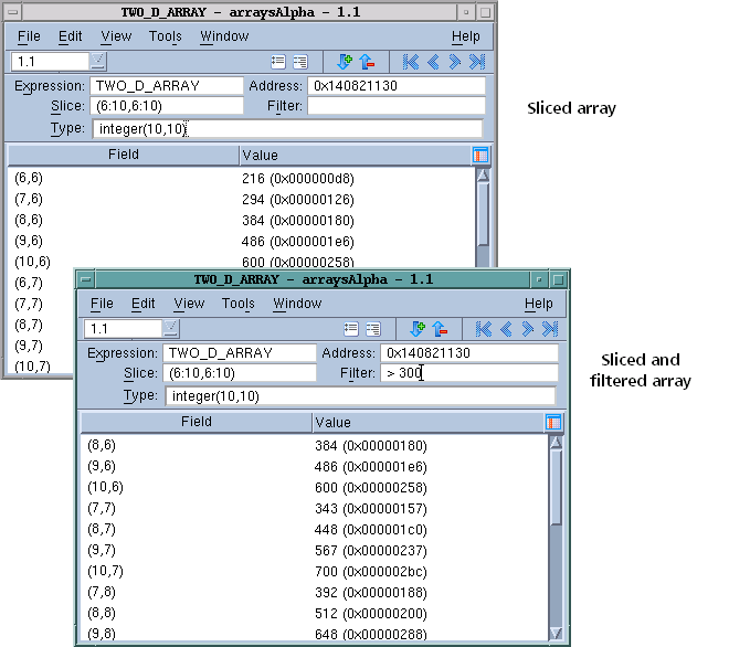 Figure 4 shows a basic slice operation that displays array elements at positions named by the slice. In this case, TotalView is displaying elements 6 through 10 in each of the array’s two dimensions.