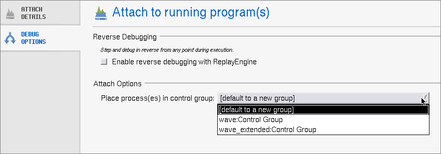 *Placing the processes to which you are attaching into a control group under the Attach Options area.