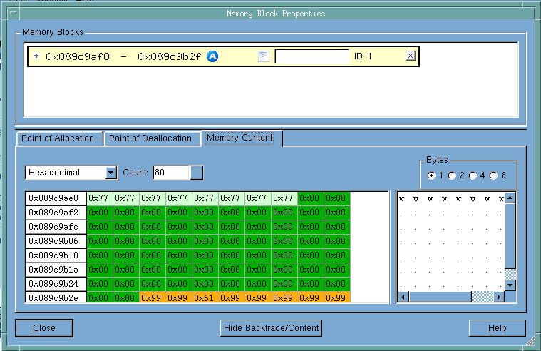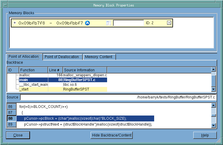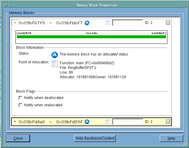 If you expand the top area of the Block Properties window manually or if you click the Hide Backtrace/Content button, you can see additional information about the memory block.