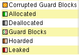 Shows a display of the blocks similar to how it is shown in the Heap Status Graphics display and other places where memory is displayed graphically. In this example, guard blocks were used, and they are indicated by the lighter green area at the ends of the block