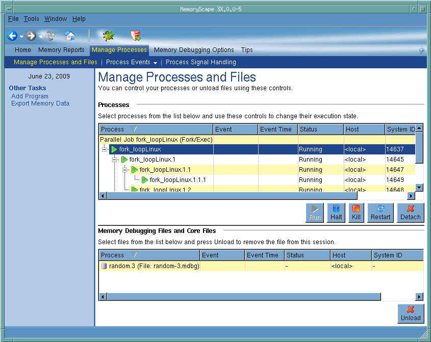Displays all processes in the current memory session. The execution controls below this area are applied to the current selection. That is, you can select one or more processes and then either halt or run just these processes.