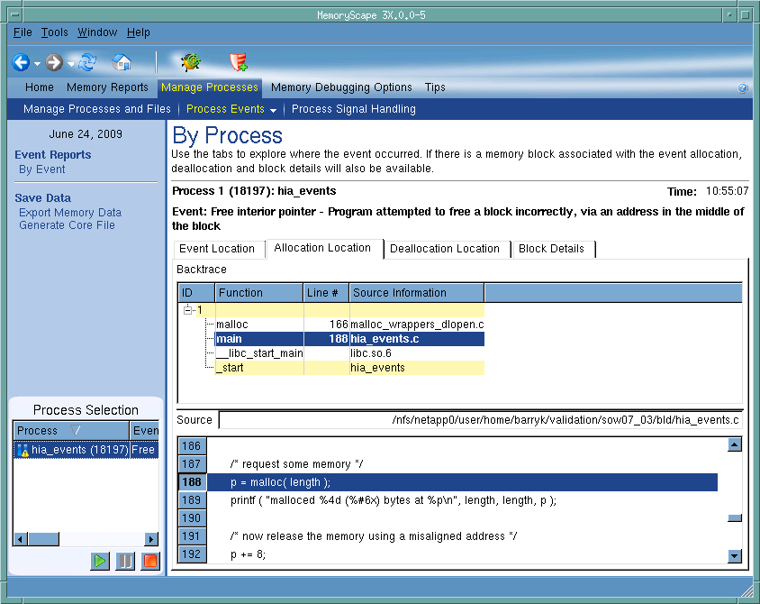 Selecting this tab displays a page showing the backtrace, source file, and source code surrounding the place where your program allocated the memory block. Not all events have this information. For example, if your program tried to free stack memory, there would not be block allocation information.