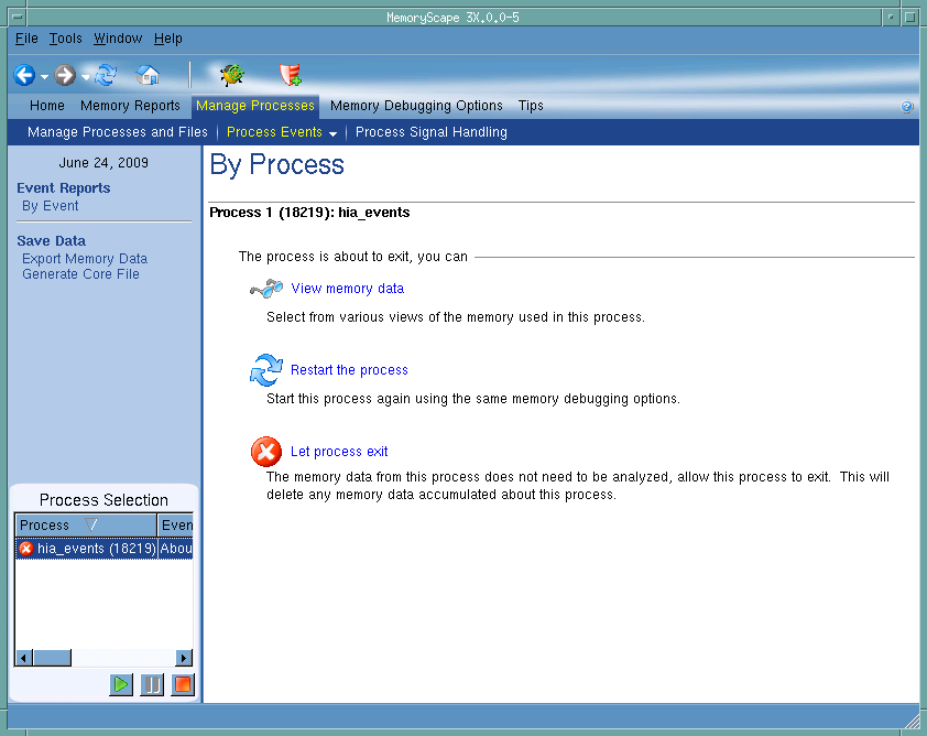 MemoryScape displays this Process Event screen when you select an event indicator that was raised when your program was about to exit. This only occurs if the Halt execution at process exit option is set, which is the default.