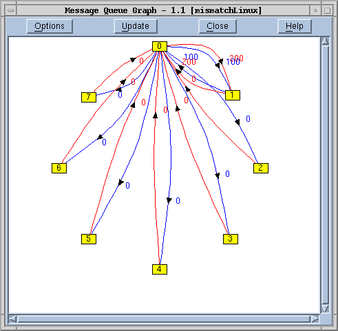 TotalView responds by displaying the message queue graph. Here, ranks are drawn as yellow boxes. The number within a box is the process’s rank.