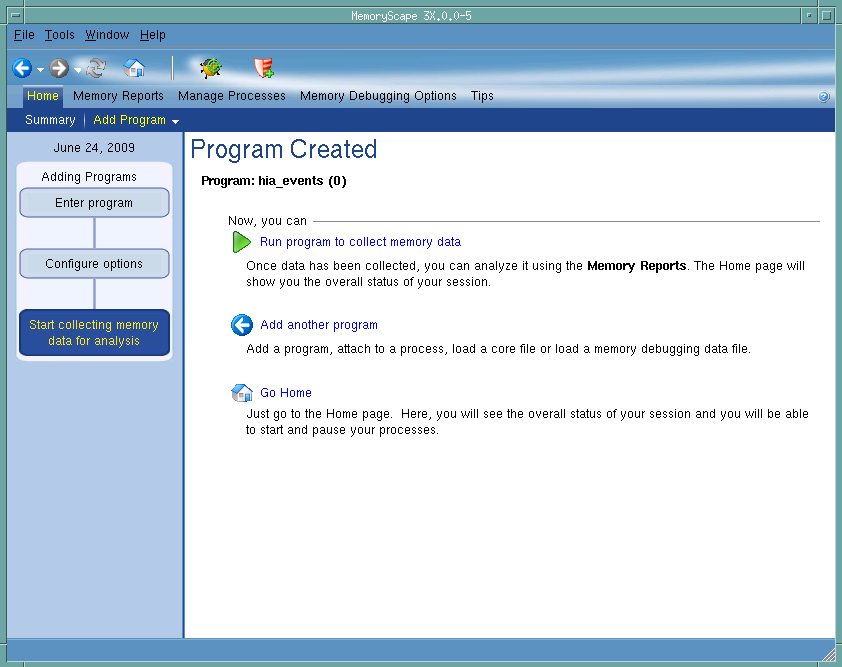 After adding a file, MemoryScape displays a screen that guides you on what to do next. The screen shown here is the one shown after you add a program. Similar screens are displayed after performing other tasks.