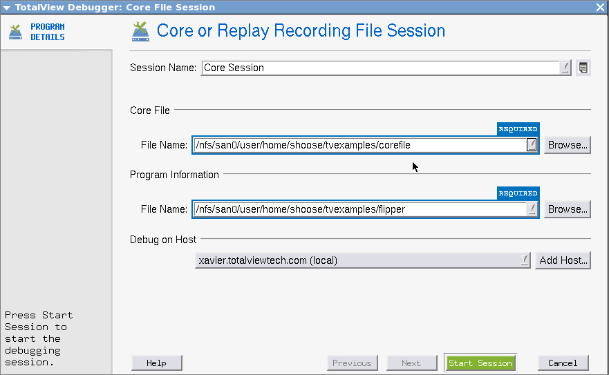 Optional) If the program and core or recording files reside on another system, enter that system’s name in the Debug on Hosts area (