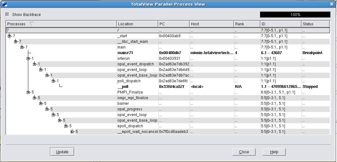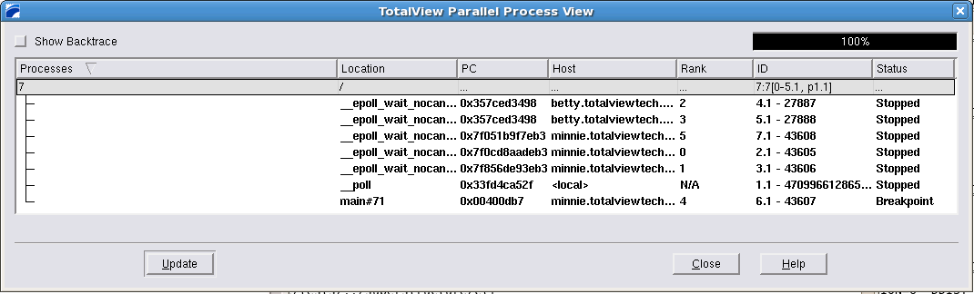 The Parallel Backtrace View displays in a single window the state of every process and thread in a parallel job. This view displays the host, status, process ID, rank, and location, enabling you to view thousands of processes from a single window. Instead of clicking through multiple windows to determine where each process has stopped, use the Parallel Backtrace View for a quick overview to help you identify stray processes.