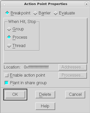 You need to be careful when setting this attribute. For example, if you tell TotalView that it should stop the thread when this breakpoint is hit and you also tell it that the satisfaction set is, for example, the workers group, your thread will stop but the remainder of the workers group will continue executing. In most cases, this is not what you would want as most of the time you will be stopping an individual thread to examine all of the program’s state at that time and TotalView cannot give you the entire state unless the other threads are also stopped.