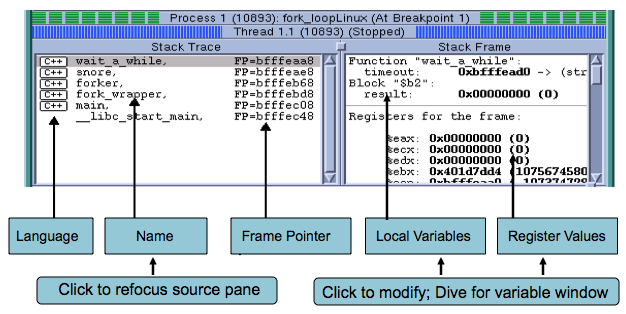 For example, the Stack Frame Pane in the Process Window contains the current call stack. When you dive on a routine, TotalView shows the routine in the Source Pane and its variables in the Stack Frame Pane.