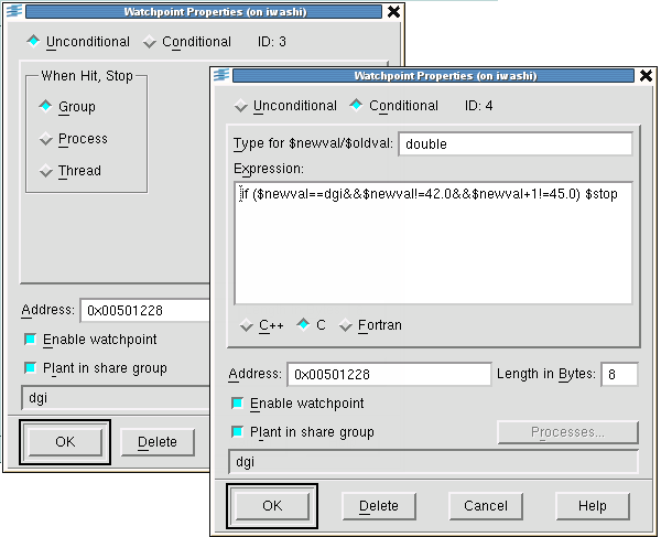 Controls in this dialog box create unconditional and conditional watchpoints. When you set a watchpoint, you are setting it on the complete contents of the information being displayed in the Variable Window. For example, if the Variable Window displays an array, you can set a watchpoint only on the entire array (or as many bytes as TotalView can watch.) If you only want to watch one array element, dive on the element and then set the watchpoint. Similarly, if the Variable Window displays a structure and you only want to watch one element, dive on the element before you set the watchpoint.