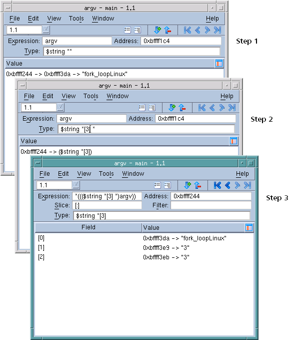 Typically, argv is the second argument passed to main(), and it is either a char **argv or char *argv[ ]. Suppose argv points to an array of three pointers to character strings. Here is how you can edit its type to display an array of three pointers: