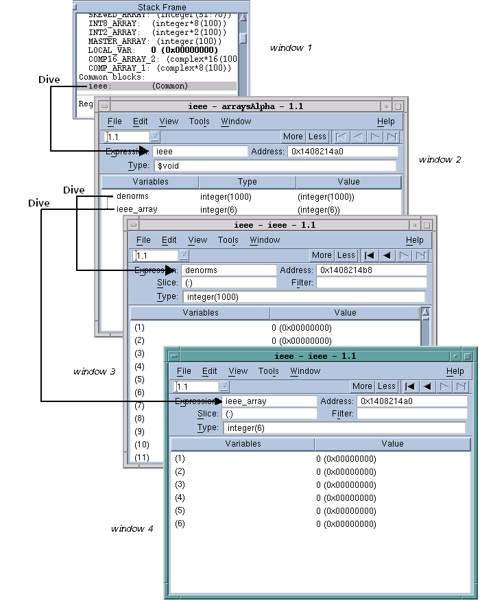 Window 1 in this figure shows a common block list in a Stack Frame Pane. After several dives, Window 2 contains the results of diving on the common block.