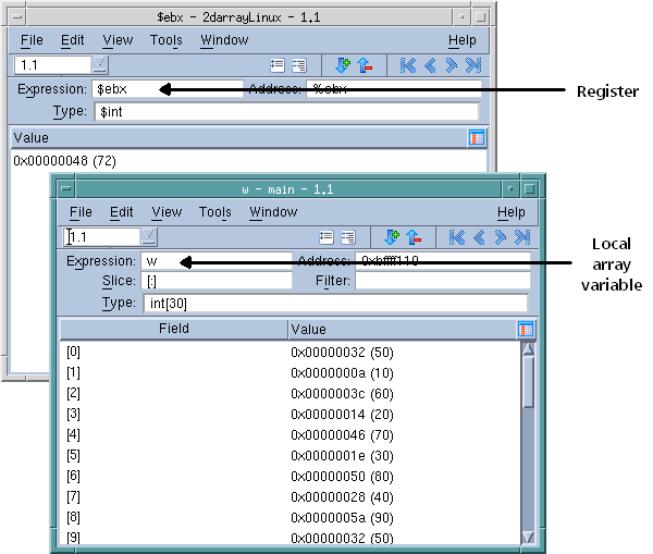 The window at the top of the figure shows the result of diving on a register, while the bottom window shows the results of diving on an array variable.
