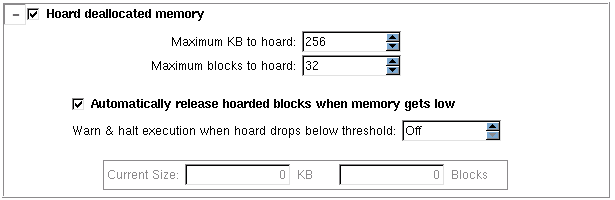 Hoarding deallocated memory may increase the risk of running out of available memory sooner than expected because deallocated memory is not released back to the heap manager. Reduce this risk by automatically releasing the hoarded memory when available memory gets low. You can also receive an event alerting you when the hoard size drops below the defined threshold. At that point, you know your program is getting close to running out of memory.