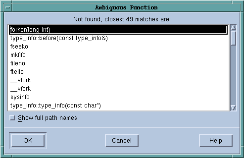 If TotalView doesn’t find the name and it can find something similar, it displays a dialog box that contains the names of functions that might match.