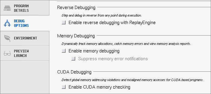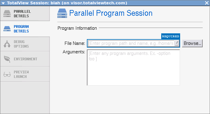 4. Select the Program Details tab to enter the file name of the program being debugged and any arguments to be sent to your program.