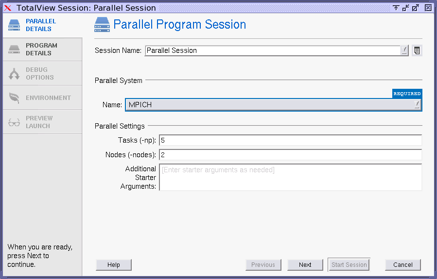 The Parallel Program Session Dialog