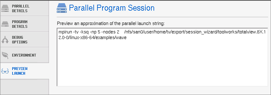 Preview Launch tab to view the launch string TotalView will use to open your debugging session.
