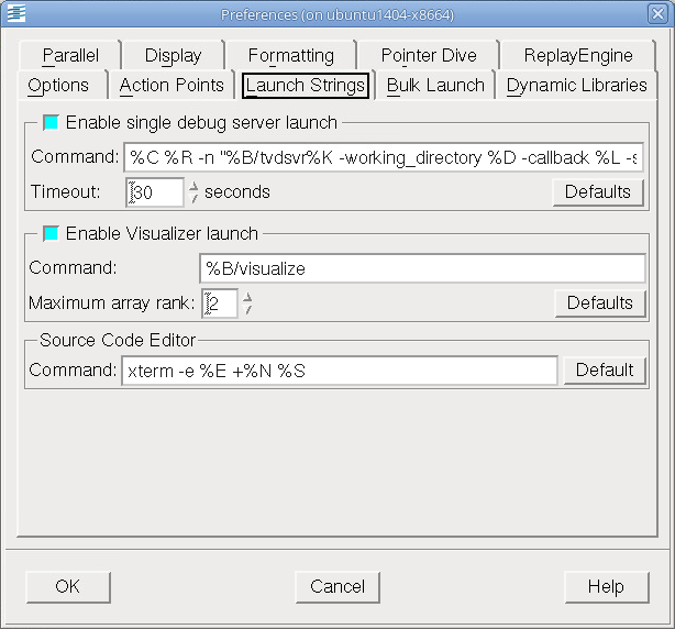 This page sets the launch string that TotalView uses when it launches the tvdsvr remote debugging server, the Visualizer, and a source code editor. The initial values are the defaults