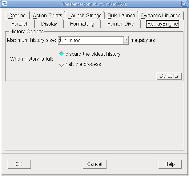 The second option on the ReplayEngine preference page defines the tool’s behavior when the history buffer is full. By default, the oldest history will be discarded so that recording can continue. You can change that so that the recording process will simply stop when the buffer is full.