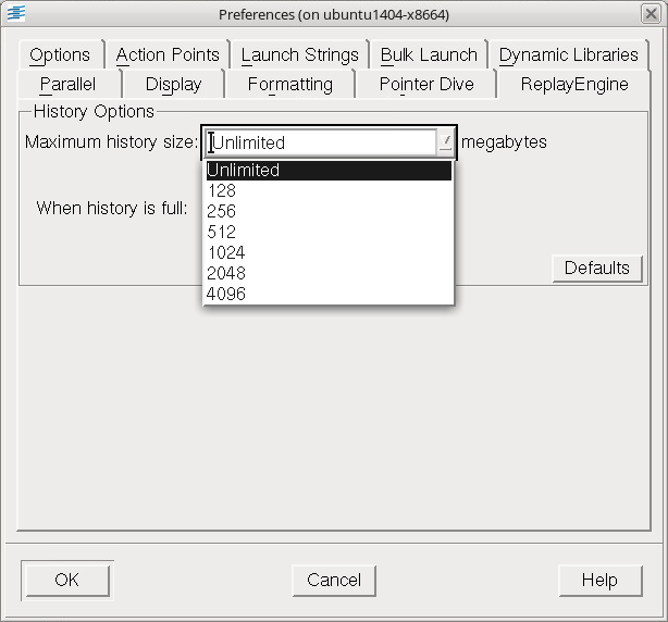 Maximum history size option sets the size in megabytes for ReplayEngine’s history buffer. The default value, Unlimited, means ReplayEngine will use as much memory as is available to save recorded history. You can enter a new value into the text field or select from a drop-down list, as seen in